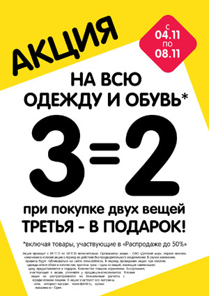 Внимание: В интернет-магазине акция не суммируется с другими действующими акциями. В рамках одного заказа можно принять участие только в одной акции. Принять участие в акции нельзя при использовании промо-кода на скидку. При покупке в интернет-магазине положите в корзину сразу 3 товара из ассортимента одежды и обуви – стоимость одного из них автоматически распределится в виде скидки на товары, участвующие в данной акции. Количество товара ограничено.